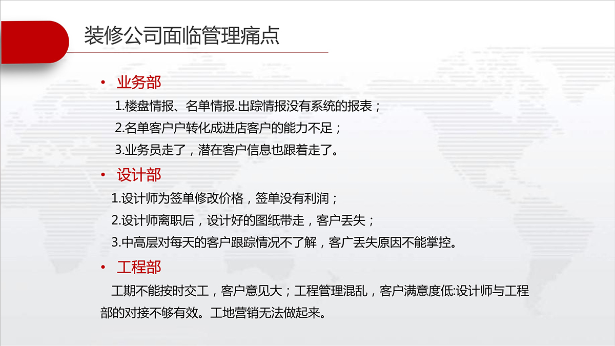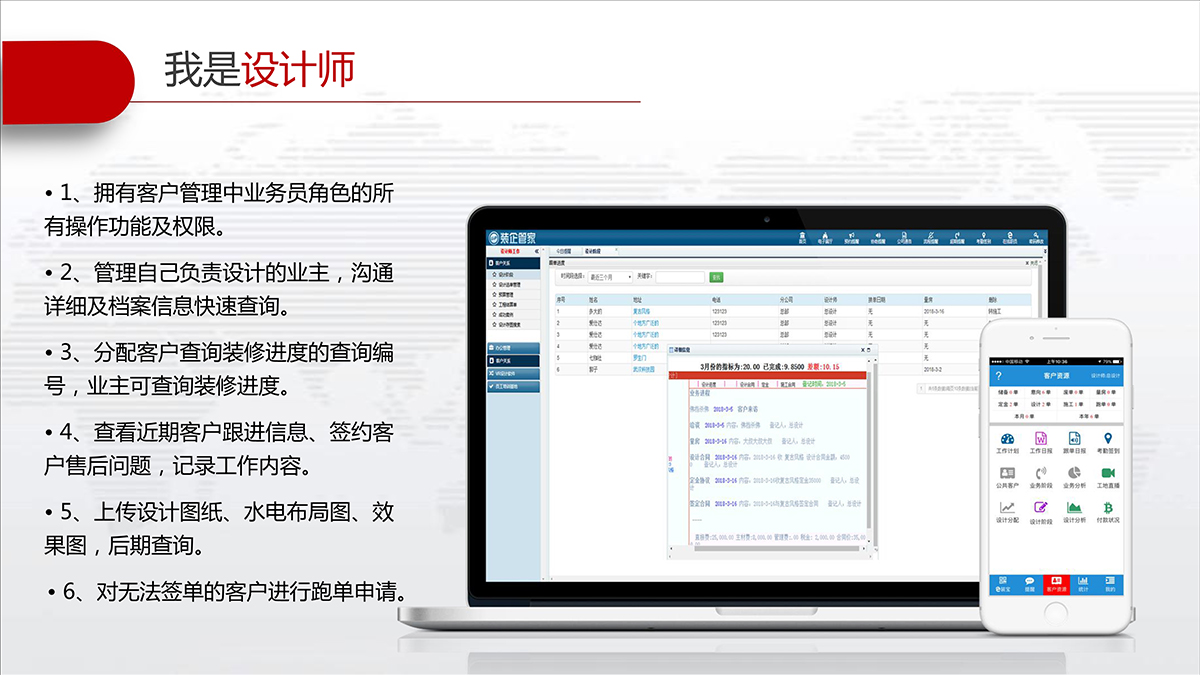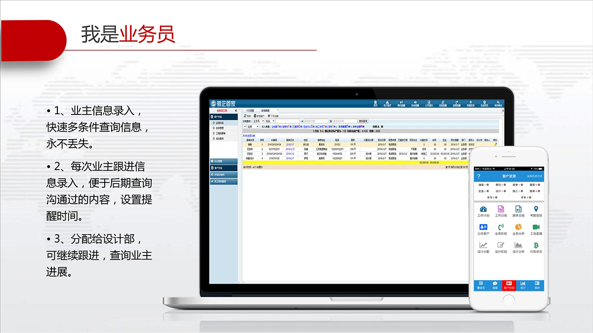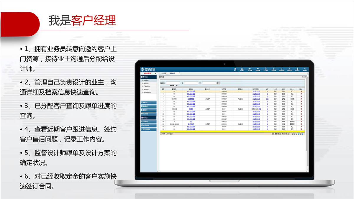装企管家可以完整记录客户资料及联系情况不丢失,快速查询信息,客户状态及跟进情况一目了然;及时提醒相关人员完成各自的工作,并提供相应的工具、标准、分析等从而实现客户服务的标准化。