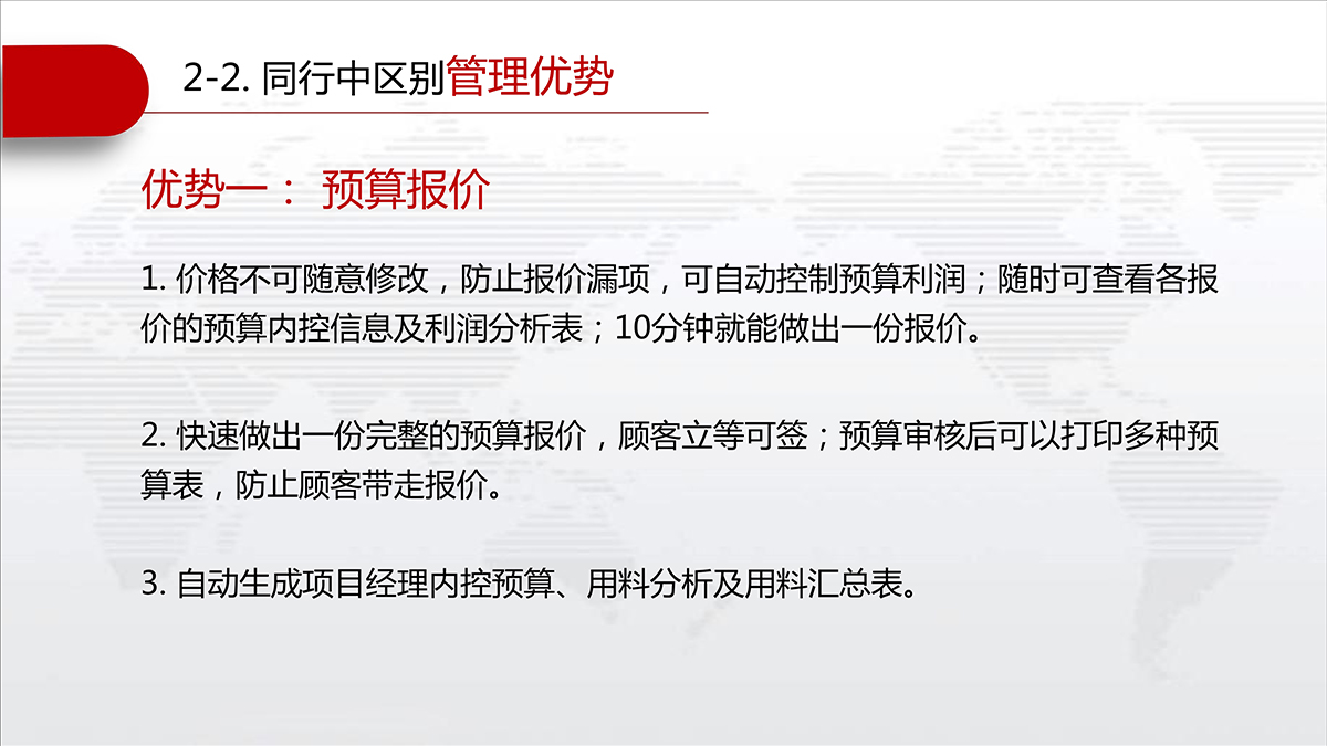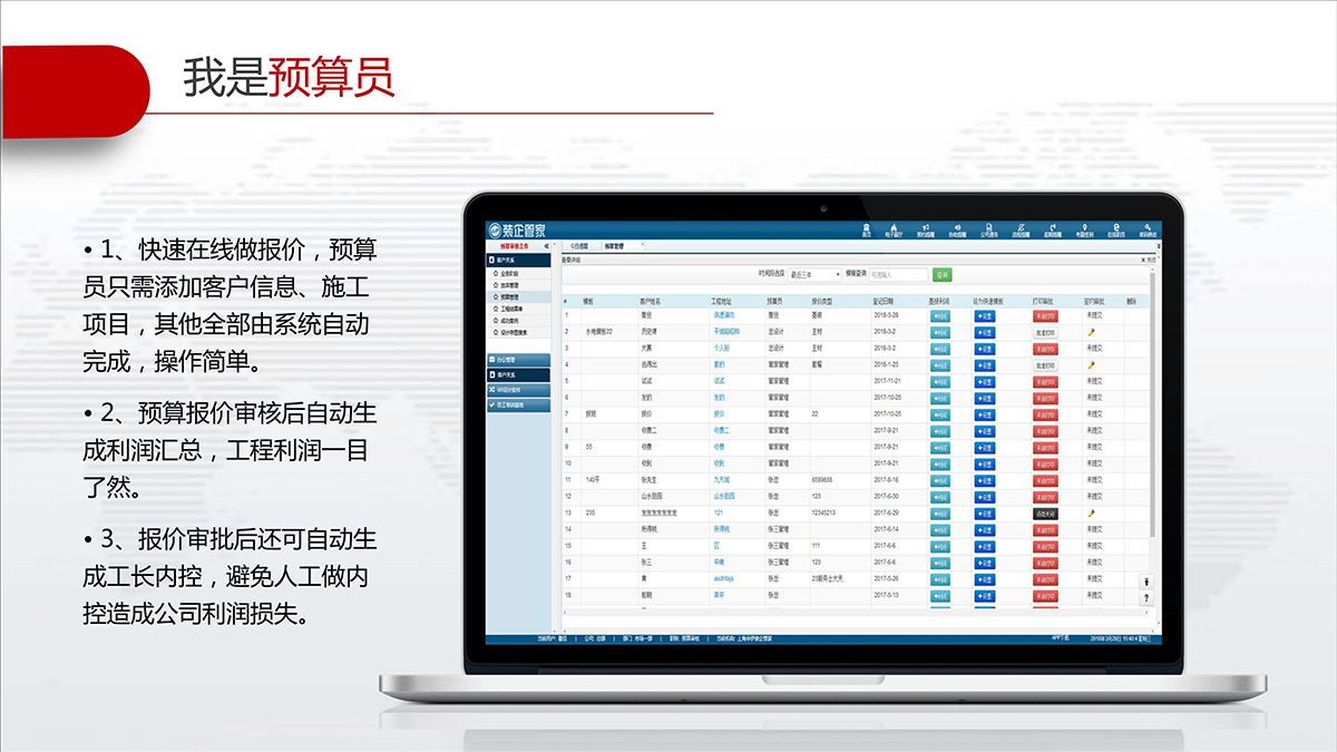 三分钟快速出预算报价,项目经理发包表、主材采购控制表、成本分析表等同步生成。领导可以掌控每份报价利润分析,实现自动控制报价利润、防止漏项。