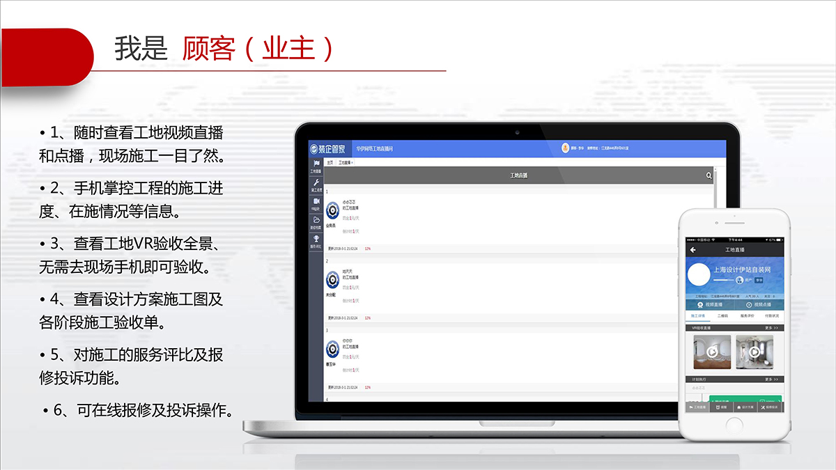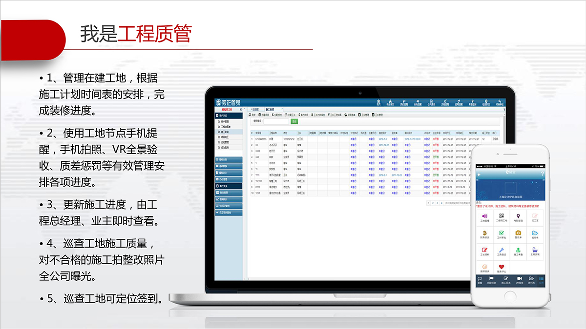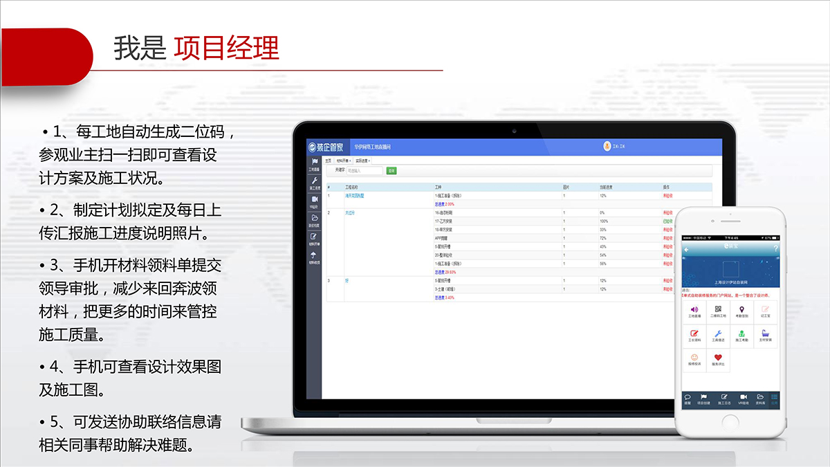 施工从现场源头抓起,打通从一线操作与远程监管数据链条;实现质量、安全、材料及各个环节的智能化互联网管理,提升企业管理水平。还能多方面展现工地形象,为工地营销保驾护航;二维码可在公司、活动、展会、现场工地扫一扫即可掌控施工各个环节状况。