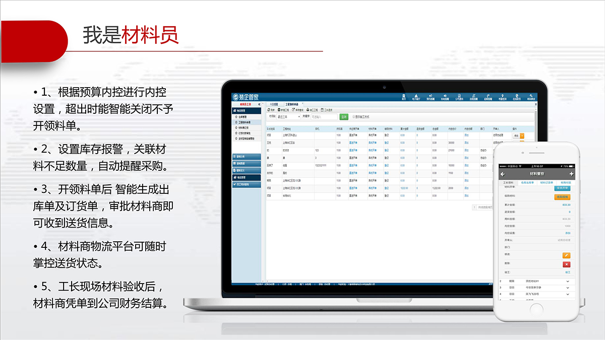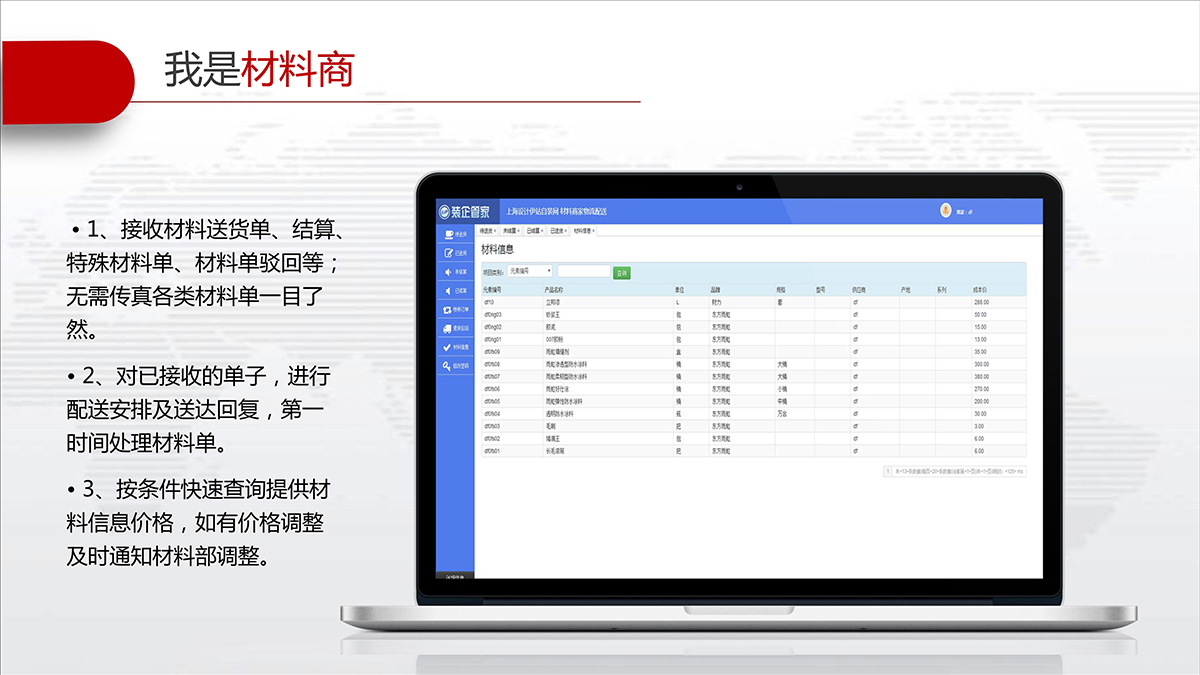 全面打通了装企、材料供应商及工地之间的物流信息桥梁,装企开采购单并调拨单后,系统会自动推送给供应商平台提醒发货,工地验收材料后完成供应,并根据供需双方付款约定自动进行结算。